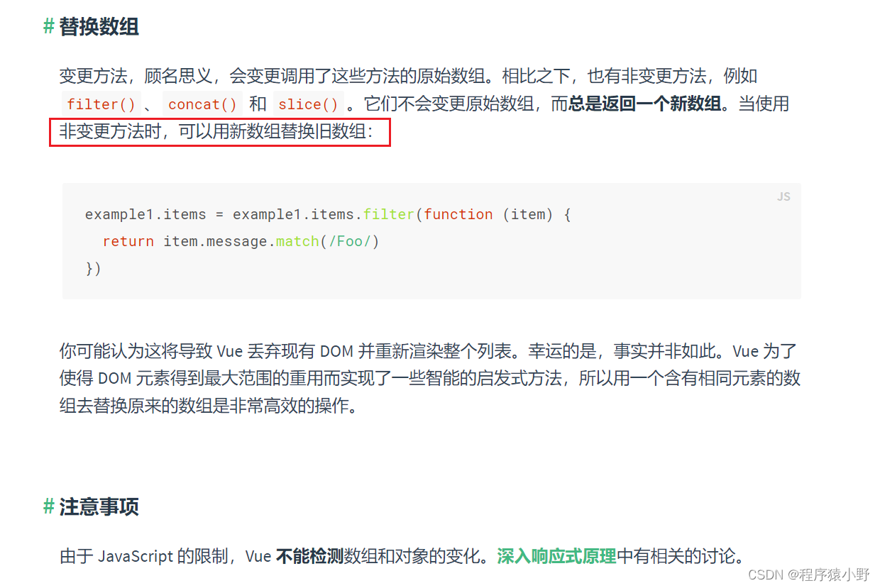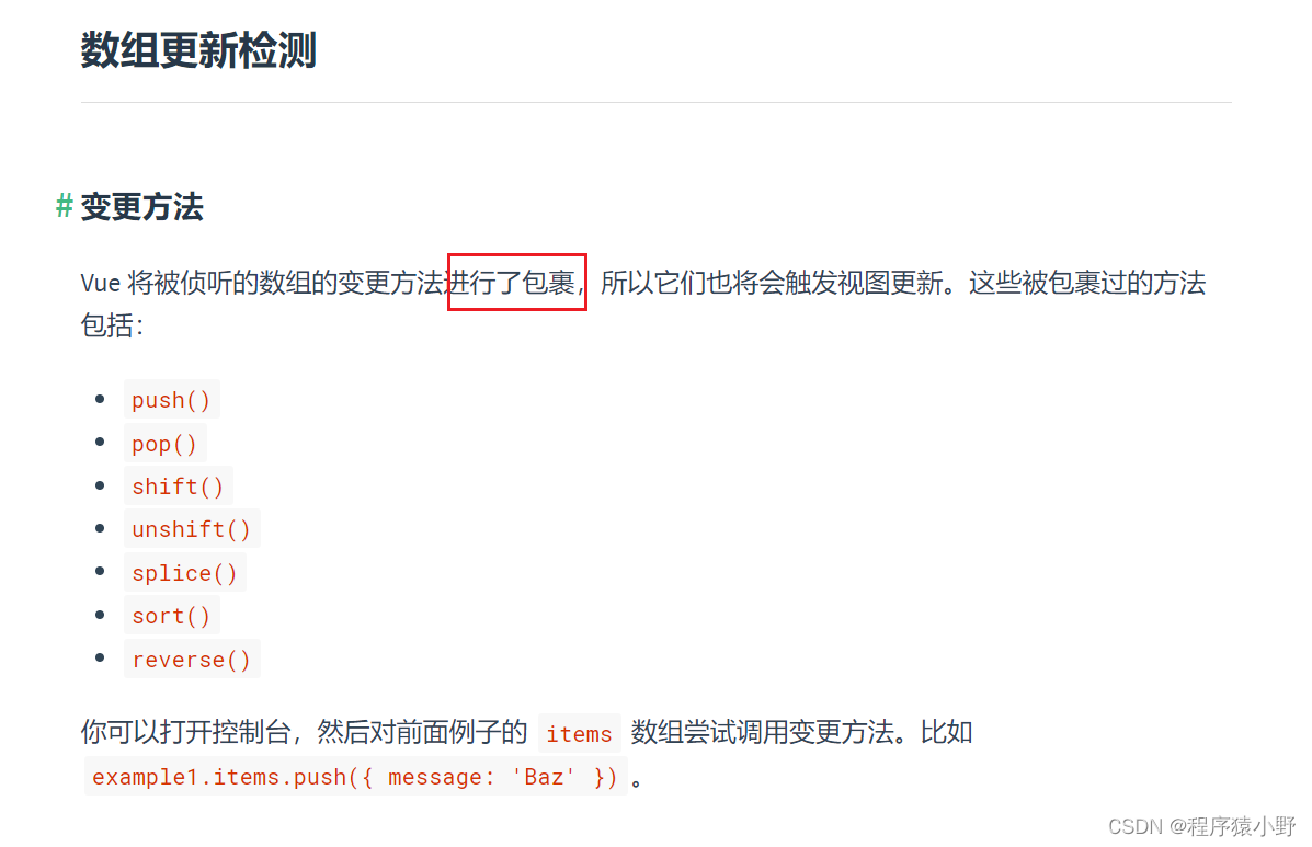 Vue2的官方文档也写了,数组更新检测,只有下面7种方法被vue重写过的,主要做两个操作:1、先调用Array原型上对应的方法。2、重新解析模版,生成虚拟DOM