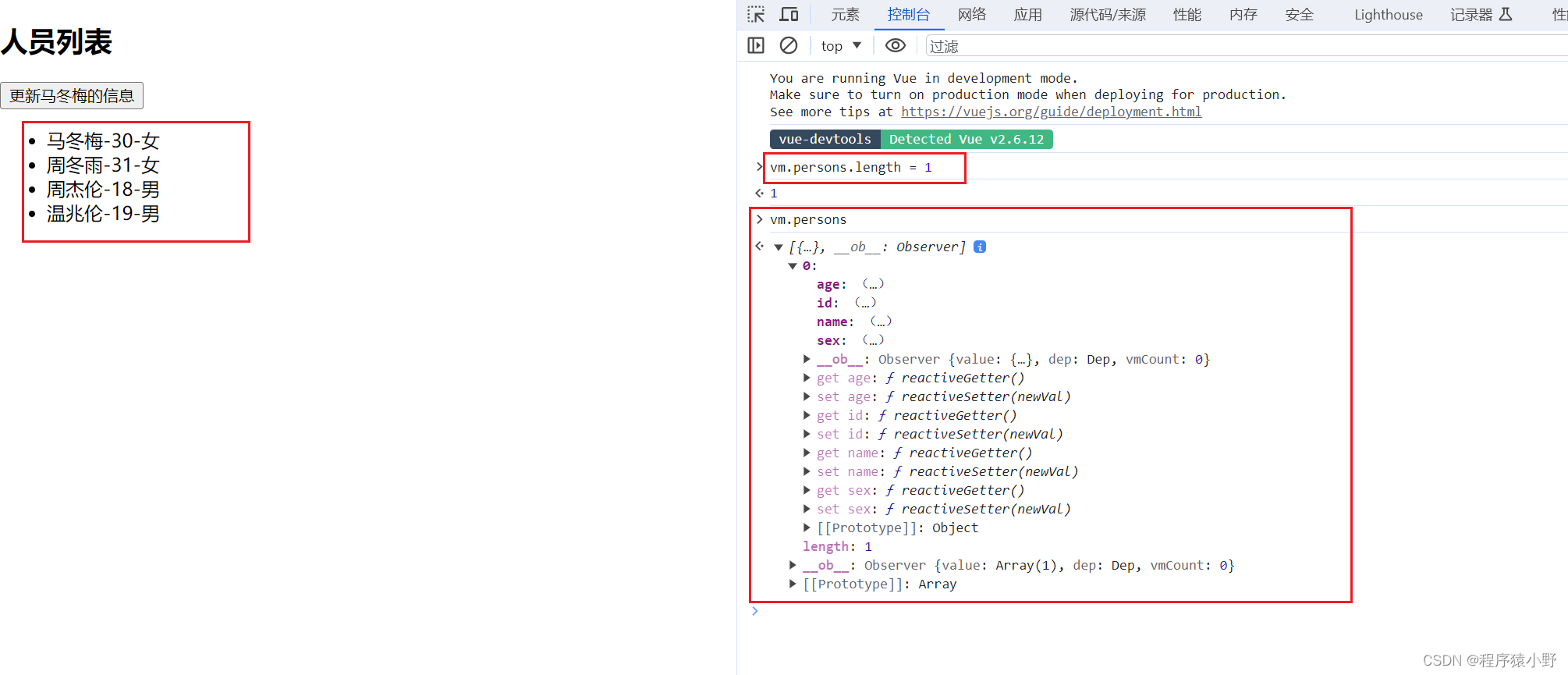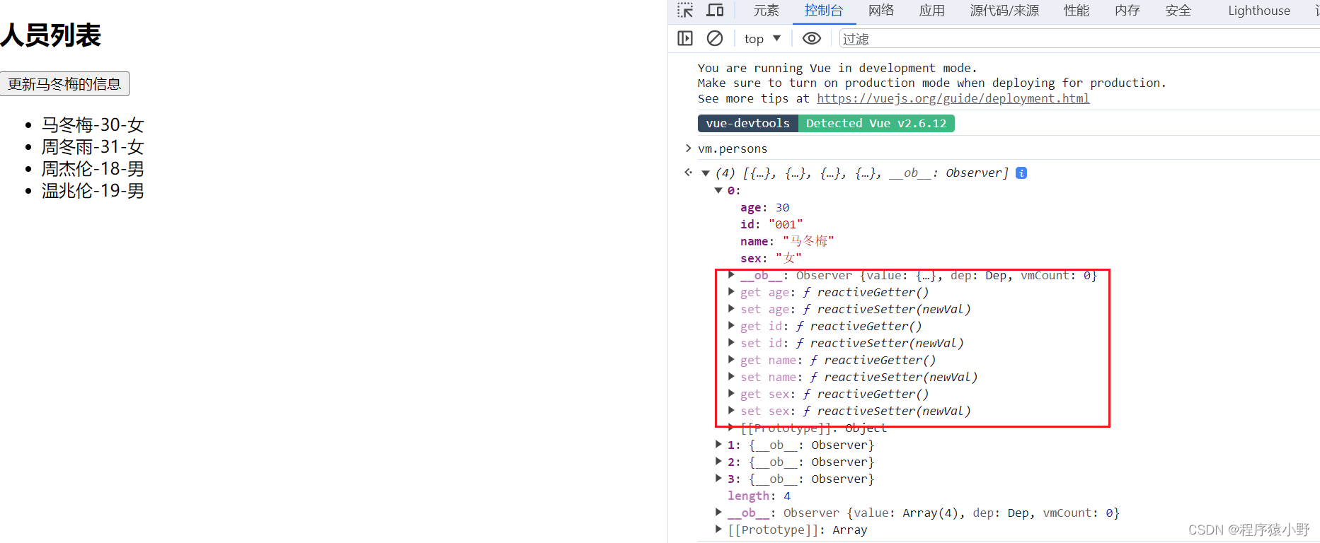 但是为什么通过数组下标.属性名 this.persons[0].name,这种修改的方式可以更新视图呢? 主要是因为数组中对象的属性都被添加了getter/setter