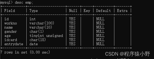 通过这条指令,我们可以查看到指定表的字段,字段的类型、是否可以为NULL,是否存在默认值等信息。