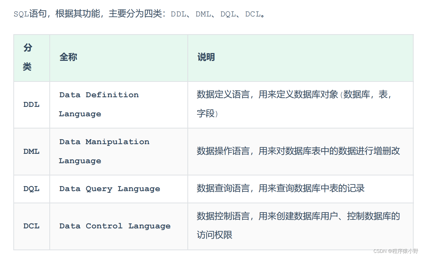 全称 Structured Query Language,结构化查询语言。操作关系型数据库的编程语言,定义了一套操作关系型数据库统一标准 。