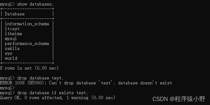 drop database [ if exists ] 数据库名 ; drop database if exists test;