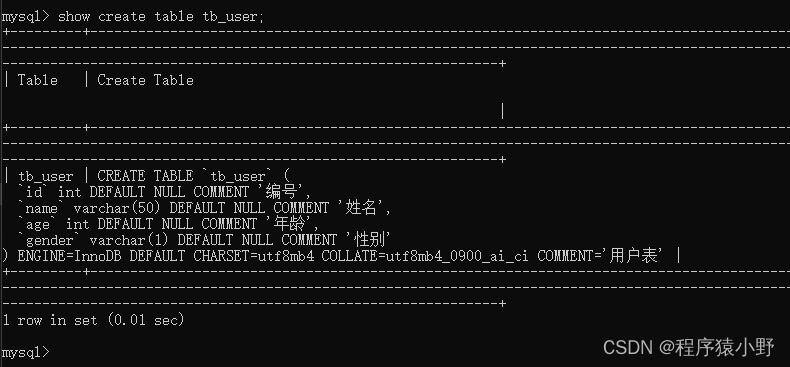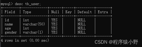 通过这条指令,我们可以查看到指定表的字段,字段的类型、是否可以为NULL,是否存在默认值等信息。