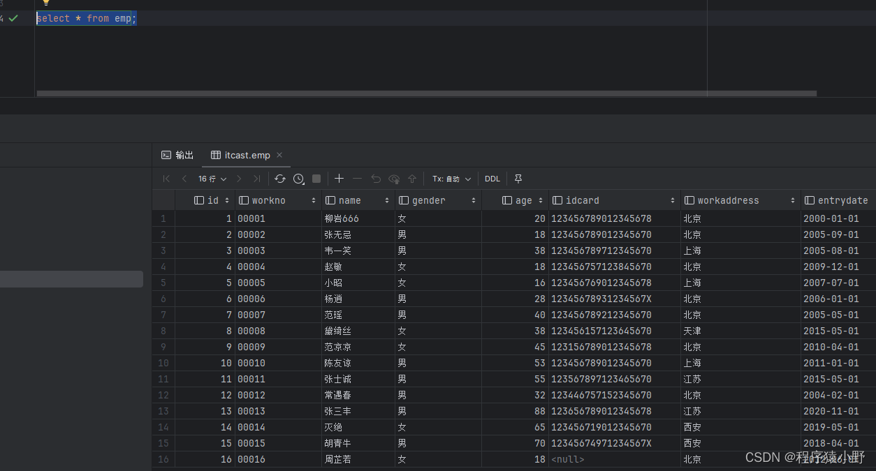 INSERT INTO emp (id, workno, name, gender, age, idcard, workaddress, entrydate) VALUES (1, '00001', '柳岩666', '女', 20, '123456789012345678', '北京', '2000-01-01');