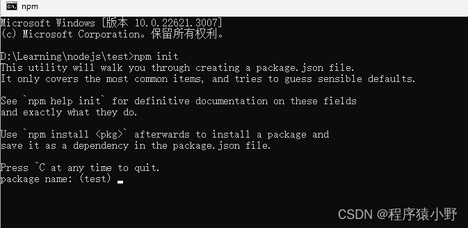 创建一个空目录,然后以此目录作为工作目录 启动命令行工具 ,执行 npm init